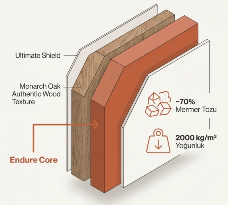 Panelin kalbinde, yaklaşık %70 mermer tozu içeren yüksek yoğunluklu mineral gövde Endure Core yer alır. 2000 kg/m³ yoğunluğuyla hem duvarda hem de zeminde, darbelere karşı kararlı ve tok bir yüzey sunar.